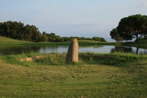 Per cert, de tornada continuem cap a dalt per el camí on havíem deixat el cotxe, que ens porta a Romanyà i aprofitem per passar pel costat del Menhir la Pedra de les Goges, dins del Golf de Mas Nou (tot un canvi de paisatge).
