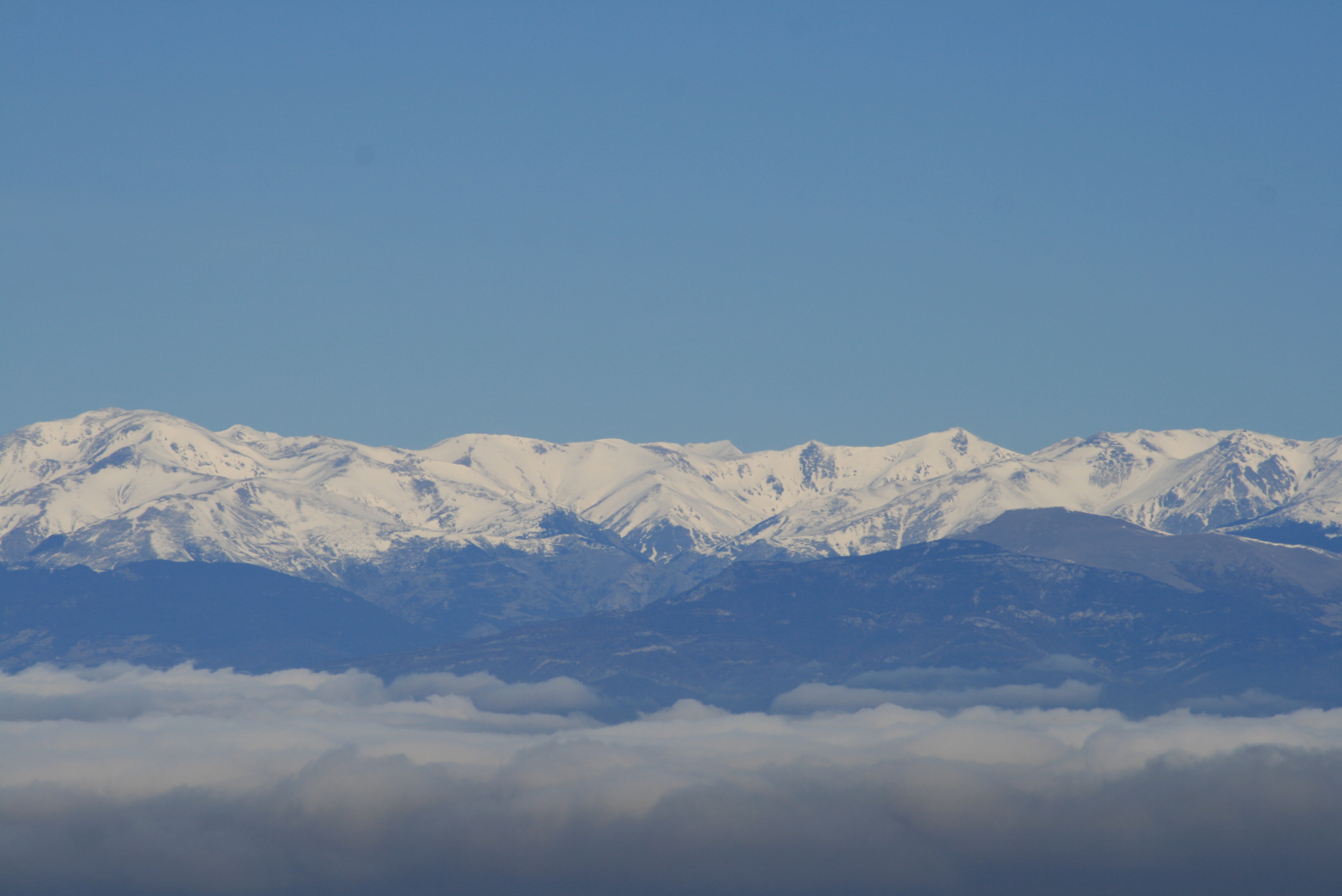 La boira a la Plana i els Pirineus nevats des del Pla de la Calma