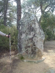 Comencem a caminar i de seguida ens trobem el ben conegut Menhir de Can Llaurador.  Per molts cops que l’hàgim vist, sempre ens sembla un dels més elegants que es troben a les nostres terres.  Posat un altre cop vertical l’any 1994, si més no és curiosa la dita de que quan estava ajagut era habitual que els que portaven els taüts dels difunts de les masies de la zona hi fessin parada per descansar.  Se non è vero, è ben trovato.