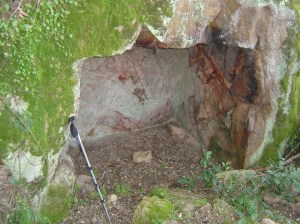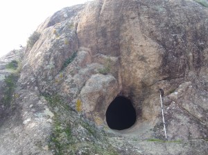 El caminet s’acaba quan arribem a una torre d’alta tensió.  Allà continuem cap amunt en un camí més ample, fins que arriba el moment esperat, en una zona d’eucaliptus replantats, en que agafem una desviació poc marcada també a l’esquerra.  Sense perdre l’esperança, continuem cap endins fins que, oh! sorpresa!, ens trobem la primera indicació de que hem arribat a l’antic poblat, la Cova excavada a la roca.