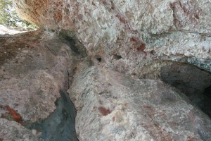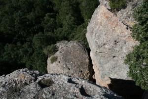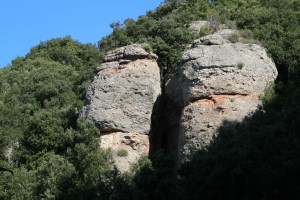 I ara ve el segon error de la jornada. Malgrat que el camí estava senyalat per muntanyetes de pedres, no el seguim correctament (probablement hauríem d’haver continuat una mica més cap a dalt) i vam fer cap un altre cop al Torrent de la Guineu. Com vam poder, el vam travessar i vam pujar fins les Roques de la Coca. No estava previst, però benvingut sigui, així les vam conèixer de prop.