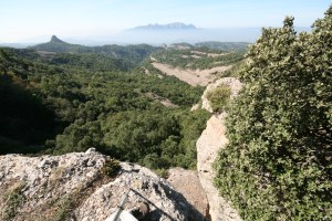 Des de dalt, tenim una magnífica vista de la Roca Falconera i d’un altre turó a l’esquerra, la Sabatera, que fins i tot ens crida més l’atenció per la forma tan plana de la part superior, com si l’haguessin tallat netament.