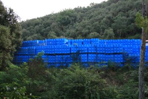 Sorprèn el gruixut mur de pedra del costat de la reixa, més propi d’una fortalesa que no pas d’una planta embotelladora d’aigua (pot-ser un antic molí?). I també sorprèn veure que hi ha activitat.