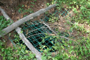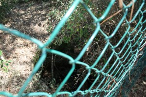 Comencem a pujar el turó i, al costat d’una tanca metàl·lica, just dins de la finca, hi veiem una curiosa boca de pou.
