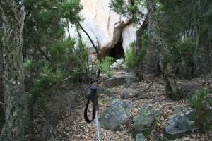 Tornem a la roca de l’anella i, després de passar pel costat d’uns eucaliptus, trobem les restes d’una barraca al costat del camí.