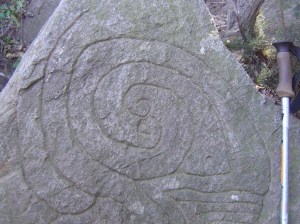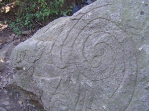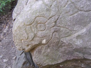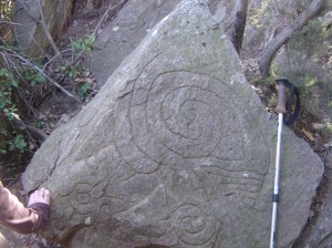 No en teníem ni idea de la seva existència, fins que arran de l’article precedent en que parlàvem de la “pedra solar” de la Sala de Comalats, mitjançant Internet l’hem coneguda. Donem les gràcies a qui han fet les pàgines següents: els gravats de Montpedrós, la “roca sagrada” del Montpedrós i al magnífic i complert article sobre l’art sobre roca a Montpedrós.