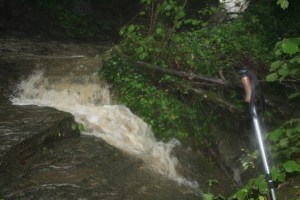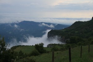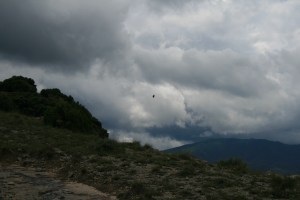 Som-hi. Torna a ploure. Arribem a Rajols. Plou, no veiem ningú, només vaques. Continuem. I entre Rajols i Rupit, ens agafa la tempesta. Llamps, trons, cada cop més a prop. Tant, que decidim deixar el camí per on anem, baixar una mica cap a la clotada, no posar-nos sota cap arbre i quedar-nos quiets sota l’aigua a l’espera que passi. Deixem els pals i altres peces metàl·liques a uns metres de nosaltres. Confiem en les soles de goma i en que estem de fet asseguts sobre les capelines. No n’hi ha prou amb els llamps i comença a caure pedra. Estem xops i ens hem de posar les mans al cap degut al mal que ens fa la pedregada. Mitja hora estem així. I no les tenim totes amb nosaltres. Però estem de sort, i els trons es comencen a sentir més lluny. En peu, recollim el material i en marxa. Quines ganes d’arribar a Rupit i seure a taula ! Segueix plovent i arribant a Rupit, el camí va paral·lel a un torrent que s’ha format. Anem en compte.