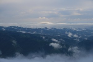 Reculem una mica el camí i comencem una petita pujada costeruda cap el Serrat de Sant Corneli. I ben aviat, passada una balma, arribem a un mirador natural sobre Tavertet, el mirador de Sant Corneli. El poble apareix i desapareix al fons entre els núvols, però la vista és magnífica. És una vista relativament semblant a la que es té des del Sunyer de Dalt, on en Quim Portet fa algunes aparicions per televisió. Quins llocs !