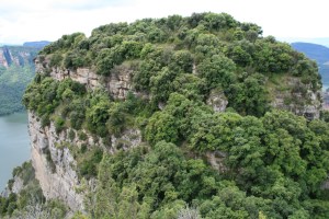 Passem pel Pla del Castell, amb un terra que dificulta el caminar. Quan arribem a l’alçada de la masia del Castell, continuem per l’esquerra. No triguem a tenir una bona vista dels cingles i la lleixa del Castell.